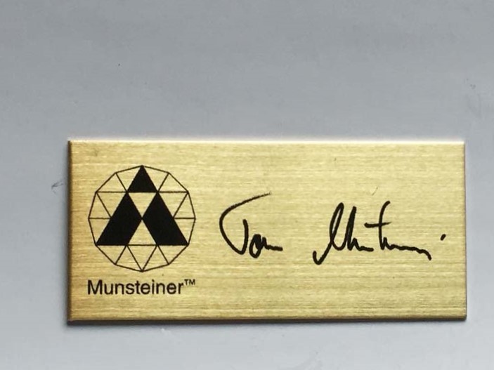 社名プレート(ロゴマークあり)です。エッチング後、色入れをせずにクリアー塗装で仕上げました。