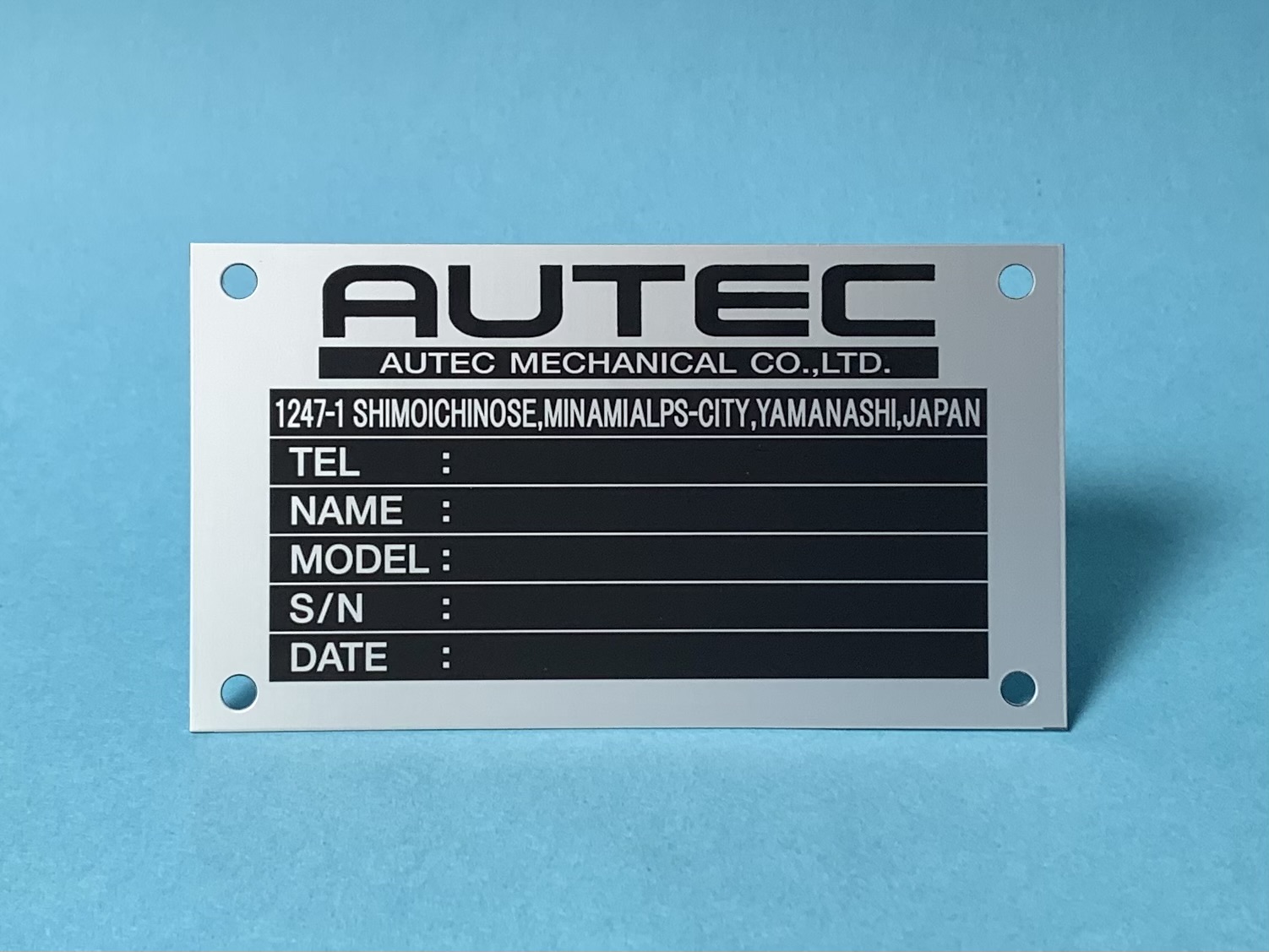 機械の管理プレートです。社屋移転に伴い住所を変更しました。